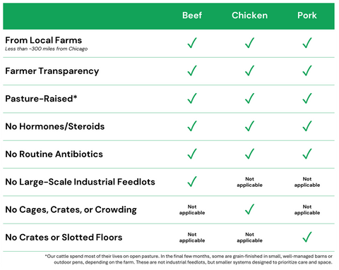 We work exclusively with Midwest farms within ~300 miles of Chicago. That means shorter supply chains, smaller carbon footprints, and fresher meat that never travels halfway across the country.