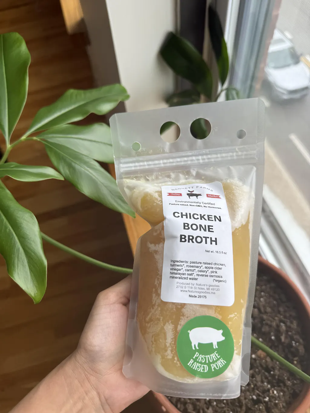Our pasture-raised chicken bone broth is slow simmered to draw out natural collagen, minerals, and rich chicken flavor. The result is a deeply nourishing broth with a clean, savory taste that adds warmth and depth to any dish. It is perfect for sipping on its own or using as a wholesome base for soups, grains, and sauces.